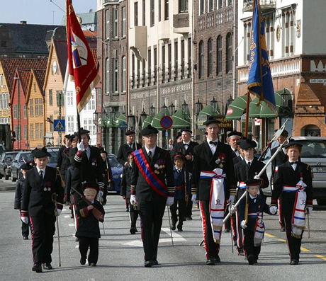 Some official recognition and commemorative mentions take place, and then it is time for the biggest feature. TWO parades -- the Main Procession and the Flag Parade – at the same time going in opposite directions along the same route! Another unique thing about Bergen’s parade is the inclusion of the Buekorps ("Bow Corps" or "Archery Brigade") formed in the middle of the 19th century in many Norwegian cities but today found only in Bergen. Buekorps is an organization for and by children where exercise, marching, sports, trips and outings are essential elements and where the officers support the young soldiers. In earlier times, it was common to distinguish between Saturday bow corps and Sunday bow corps. Those who played in the Saturday bow corps were generally from better-off families who could take Saturdays off. The Sunday bow corps were for those who only had Sundays off. Originally, only boys joined the archery corps; the first girl buekorps was formed in 1991. Today, the archery corps consists of both girls and boys and has activities on many different days of the week. The bow corps are neutral in terms of politics , religion and ethnic affiliation. The bow corps do both music and various sports, and the bow corps teach the children a lot about discipline. It's a sign of spring in Bergen when you hear the bow corps drumming through the City's streets and lanes!